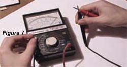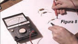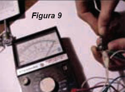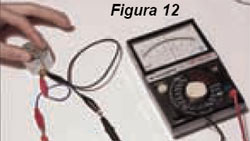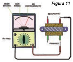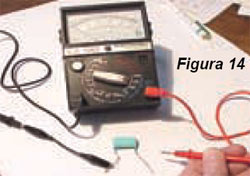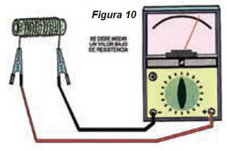 | La resistencia eléctrica es baja, por lo tanto, al realizar la medición con el Ohmetro, sólo serán unos pocos ohms. Como vemos en la figura 10. Si algunas espiras se ponen en cortocircuito, no podremos detectarlas con el Ohmetro puesto que acusará un valor bajo de resistencia. Por lo tanto, la medición de bobinas con el multímetro nos indicará si la misma está abierta o no, es decir, la continuidad de la misma. En el caso de los transformadores, podemos verificar la continuidad de cada bobinado y la aislación entre su primario y su secundario, como vemos en la figura 11. Para verificar la aislación entre bobinados, conviene utilizar la escala “R x 10K” del Ohmetro, entonces, si la aguja no se mueve (infinito Ohm), la aislación, es buena. Si nos dá cero Ohm, está en cortocircuito, y si nos dá un valor intermedio, es porque tiene fugas. Para la medición de motores de corriente continua, colocamos la llave selectora en “Rx1” o en “Rx10”, conectamos las puntas de prueba a los terminales del motor (fuera del aparato, o sea, sin estar alimentado) y girando el eje del mismo, observamos la aguja. Ver la figura 12. Si la medición resulta de un valor bajo, con algunas interrupciones, en el giro completo del eje, nos indica que el motor está en buenas condiciones. En cambio si la medición es muy alta, o directamente la aguja no se mueve, el motor tiene la bobina abierta o tiene problemas con las escobillas, las que se deberán limpiar o en su defecto cambiar. | | | | PRUEBA DE CAPACITORES CON EL MULTIMETRO |
