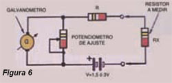 | Para esta función, el instrumento tiene una fuente de tensión continua de 1,5V (pila de zinc-carbón) u otro valor, para generar una corriente cuyo valor dependerá de la resistencia del circuito, y que será medida por la bobina. En la figura 6, se muestra el circuito del instrumento como óhmetro. Se usa la escala superior, que crece numéricamente de derecha a izquierda para leer los valores de resistencia expresados en Ohm. Siempre debemos calibrar el instrumento con la perilla “ajuste del óhmetro”. Para realizar la calibración, las puntas de prueba deben ponerse en contacto, lo cual significa poner un cortocircuito entre los terminales del instrumento, esto implica que la resistencia conectada externamente al óhmetro es nula en estas condiciones, y por lo tanto la aguja debe marcar: cero ohm. Para ello variamos el potenciómetro “ohm adjust” -en inglés- hasta que la aguja se ubique justo en el “0” ; en ese momento, estará circulando por la bobina del intrumento, la corriente de deflexión a plena escala (vea la figura 7). Cuando conectamos las puntas de prueba a un resistor R, la corriente por el galvanómetro disminuirá en una proporción que depende del valor de R; de ahí que la escala de resistencia aumente en sentido contrario al de corriente. Para medir resistores de distinto valor, existen 2 ó 3 rangos en la mayoría de los óhmetros marcados de la siguiente manera: x1, x10, x100 y x1k. Si la llave selectora está en “x 1” el valor leído será directamente en ohm; si está en “x 10”, debemos multiplicar el valor medido por 10 para tener el valor correcto en ohm; y si está en “x 1k”, la lectura directa nos da el valor correcto de resistencia en kOhm. Puede suceder que al calibrar el óhmetro, la aguja no llegue a cero; en ese caso, es necesario medir la tensión de la pila, por qué puede estar gastada, y si ése no es el caso, el problema puede deberse a la bobina o a un componente del circuito del óhmetro en mal estado. Si la pila está gastada, debemos reemplazarla por una nueva. | | | | MEDICIONES DE RESISTORES CON EL OHMETRO |