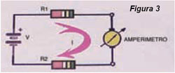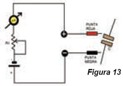 | Cuando no conocemos el valor de la corriente que vamos a medir, debemos colocar la llave selectora en el rango más alto de corriente y luego ver cómo deflexiona la aguja; si es muy poco, significa que la corriente es más baja de lo que esperábamos y entonces pasamos al rango inmediato inferior; si ocurre lo mismo, volvemos a bajar de rango, y así sucesivamente hasta que la aguja se ubique aproximadamente en la parte superior de la escala. También debemos observar en qué sentido tiende a desplazarse la aguja: si lo hace hacia la izquierda, por debajo de cero, debemos invertir la conexión de las puntas de prueba para que la deflexión de la aguja ocurra en sentido horario. | | | | EL MULTIMETRO COMO OHMETRO |