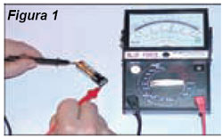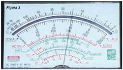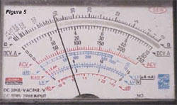 Comenzamos con la medición del voltaje en una pila de 1,5 Volt, algo gastada, para ver en qué estado se encuentra la misma. Para realizar la medición de voltajes, colocamos la llave selectora del multímetro en el bloque “DCV” siglas correspondientes a: Direct Current Voltage, lo que traducimos como Voltaje de Corriente Continua, puesto que la pila constituye un generador de corriente contínua. Colocamos la punta roja en el electrodo positivo de la pila, la punta negra en el negativo, la llave selectora en la posición “2,5“ y efectuamos la medición. Lo vemos en la figura 1. La llave selectora indica el valor máximo que podemos medir de tensiones continuas en volt. Como hemos seleccionado 2,5 Volt, entonces la escala que tiene como máximo valor el número “250”, se transformará en un valor máximo de 2,5 Volt, luego, en la misma escala: El número 200 equivale a: 2 Volt 150 equivale a: 1,5 Volt 100 equivale a: 1 Volt 50 equivale a: 0,5 Volt Estos valores los podemos apreciar en la cuarta escala graduada (comenzando desde arriba) en la figura 2. Al efectuar la medición, la aguja quedará entre dos números de la escala seleccionada. Al número menor lo llamaremos: “Lectura menor”, y al número mayor, “Lectura Mayor”. A la Lectura menor, se le deberá sumar la cantidad de divisiones que tenemos, hasta donde se detuvo la aguja. El valor de cada una de las divisiones, se calcula mediante la fórmula: Vdiv. = (LM - Lm) ÷ Cdiv. Donde: Vdiv. = Valor de cada división LM = Lectura Mayor Lm = Lectura menor Cdiv.= cantidad de divisiones entre Lm y LM. En nuestro caso resulta: Vdiv.= (1,5V - 1V) ÷ 10 = 0,05V Finalmente, el valor medido, resulta de sumar a la Lectura menor, la cantidad de divisiones hasta donde se detuvo la aguja, o sea, nueve divisiones, por lo tanto: Valor medido = 1 V + 9 x 0,05 V = 1,45V Cuando realizamos la medición de Voltajes o Corrientes con el multímetro, pueden ocurrir cuatro posibilidades con la aguja, y éstas son: -
